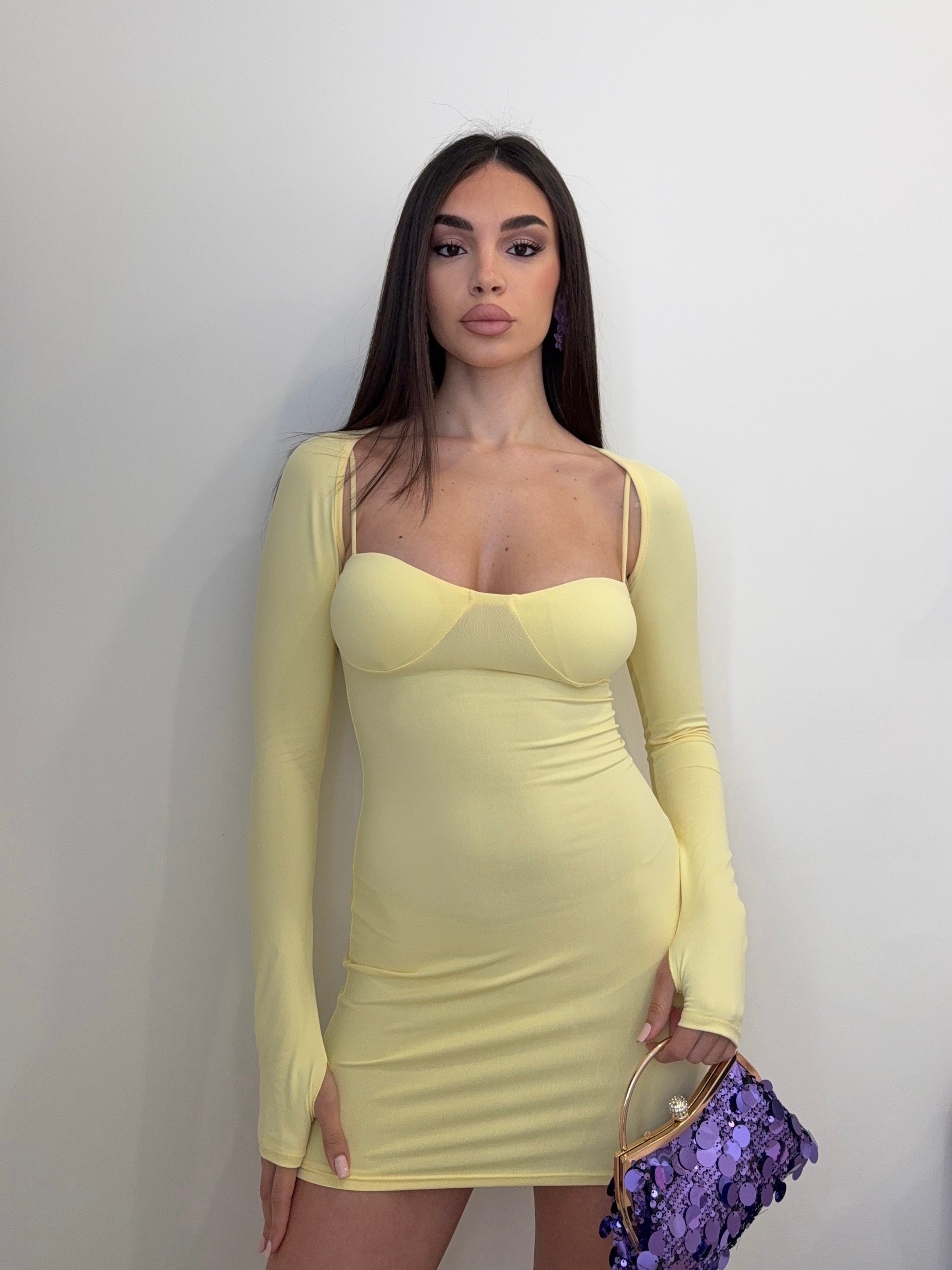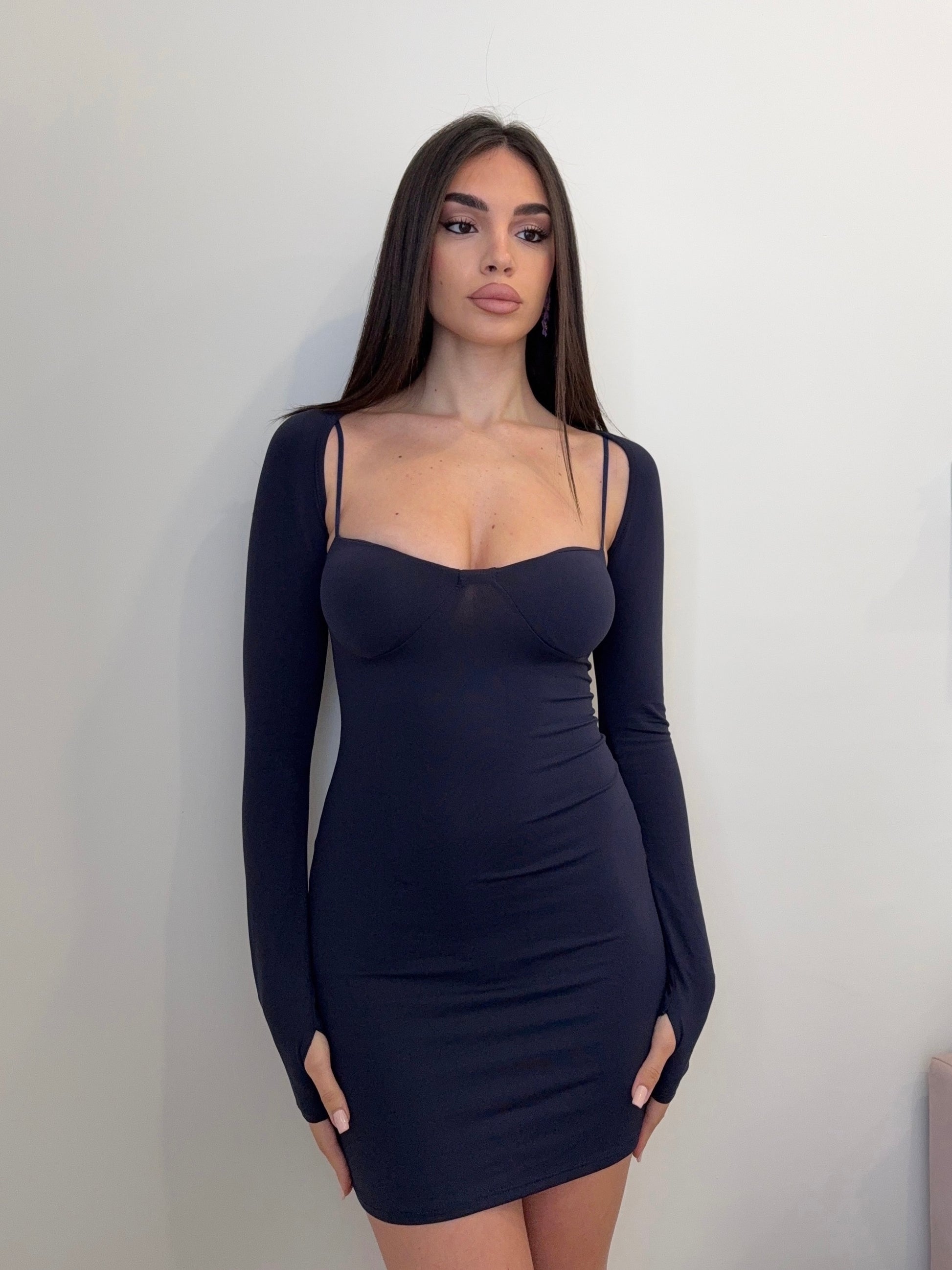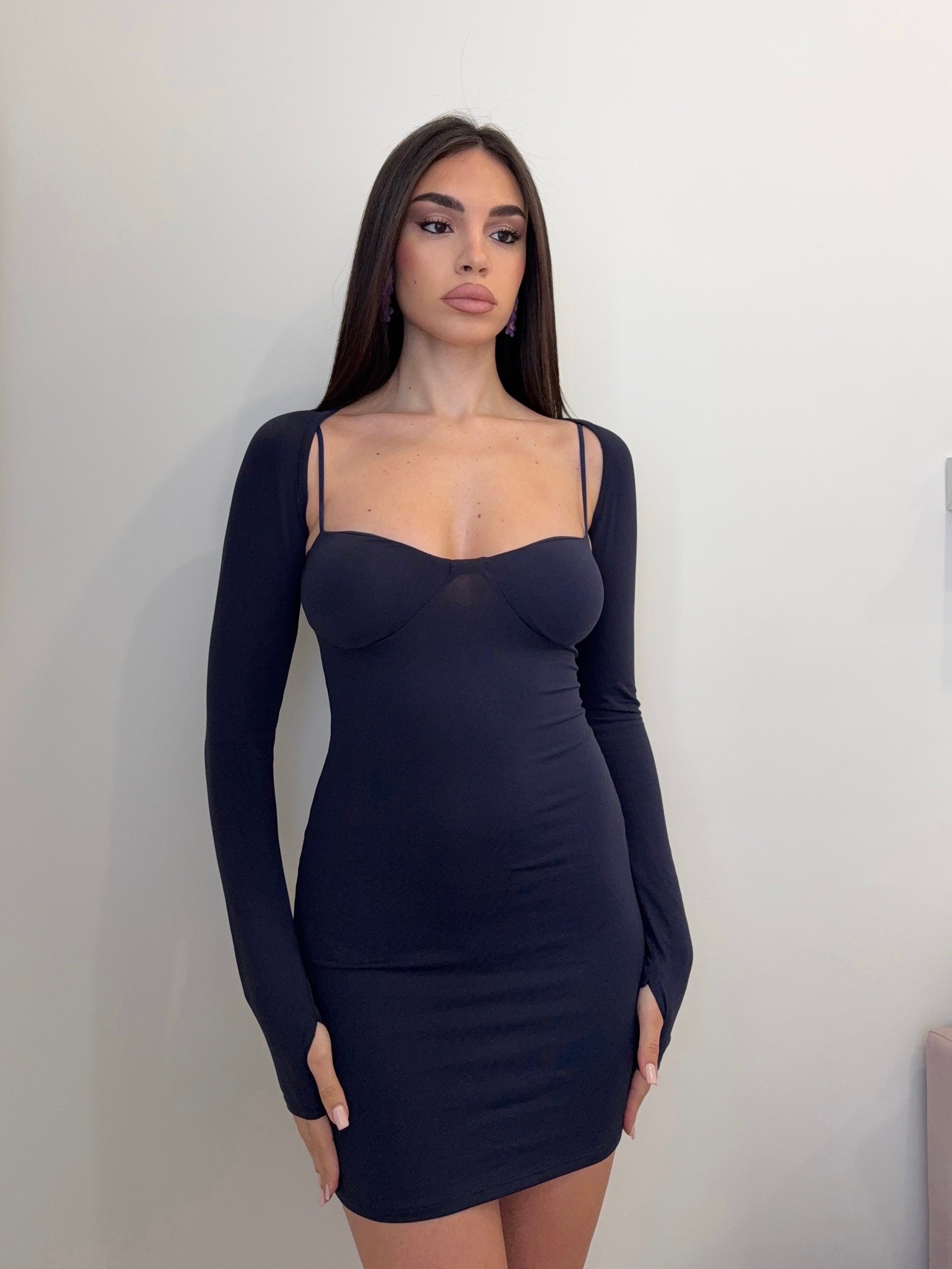 Abitino corto e aderente, abbinato a coprispalle con maniche a guanto