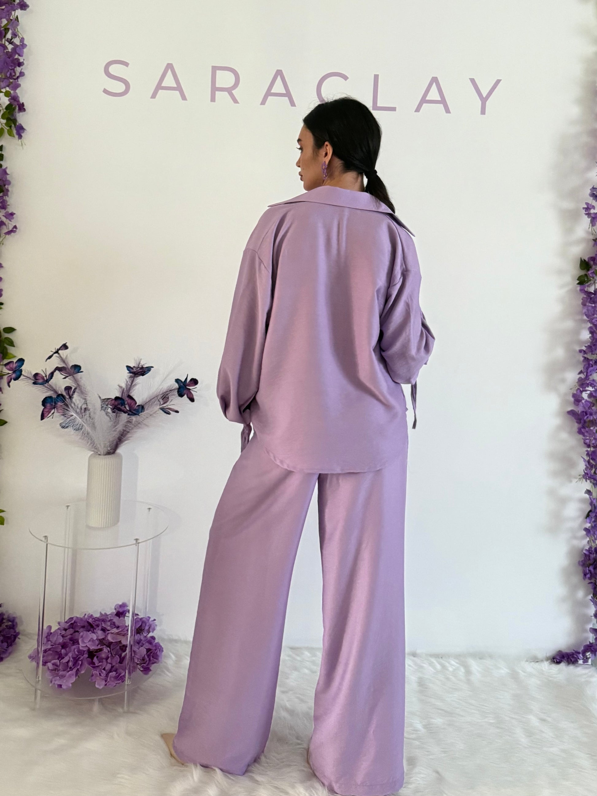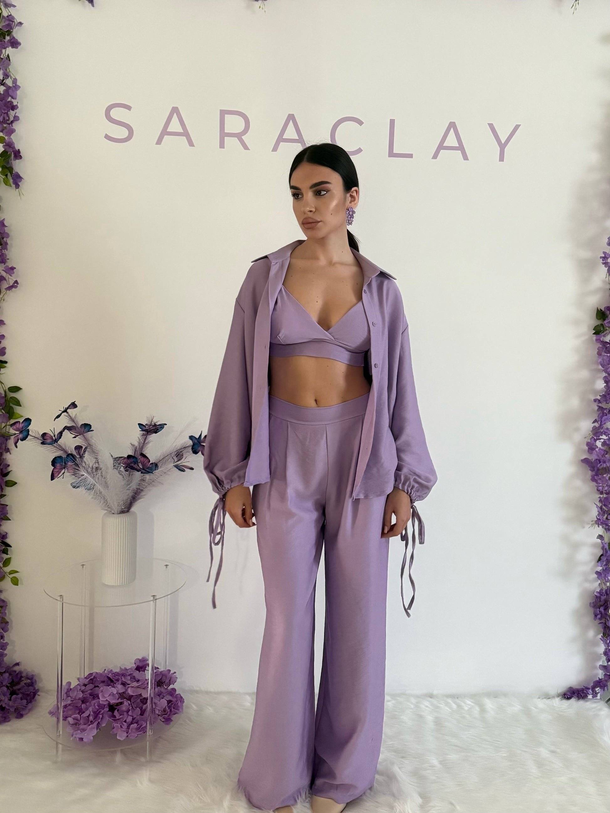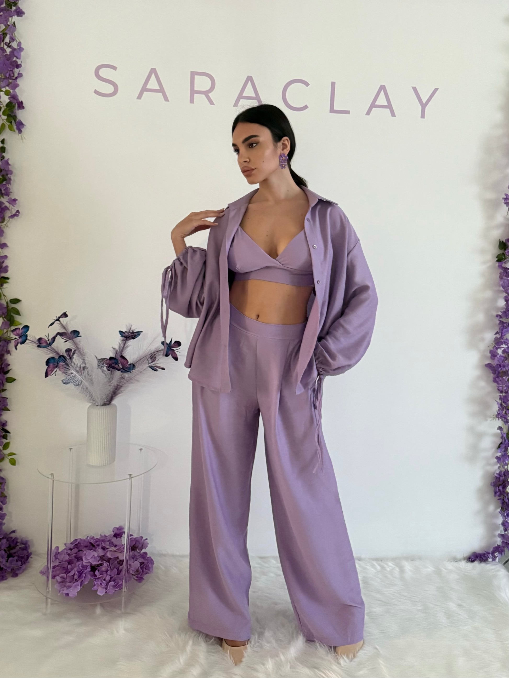 Completo lilla super cool: top a reggiseno effetto body, camicia over portata aperta e pantaloni larghi a vita alta. Tutto over, ma con stile.