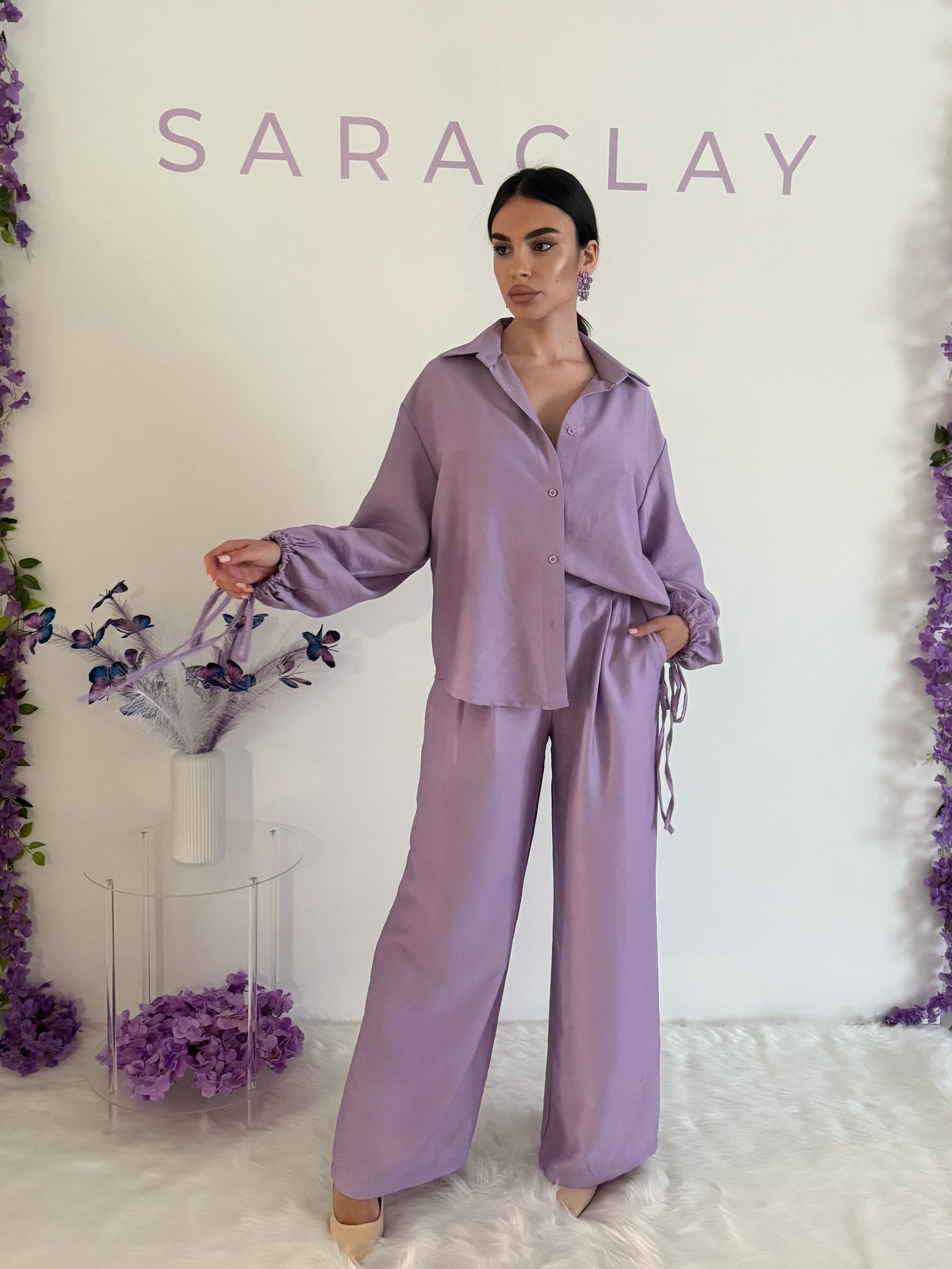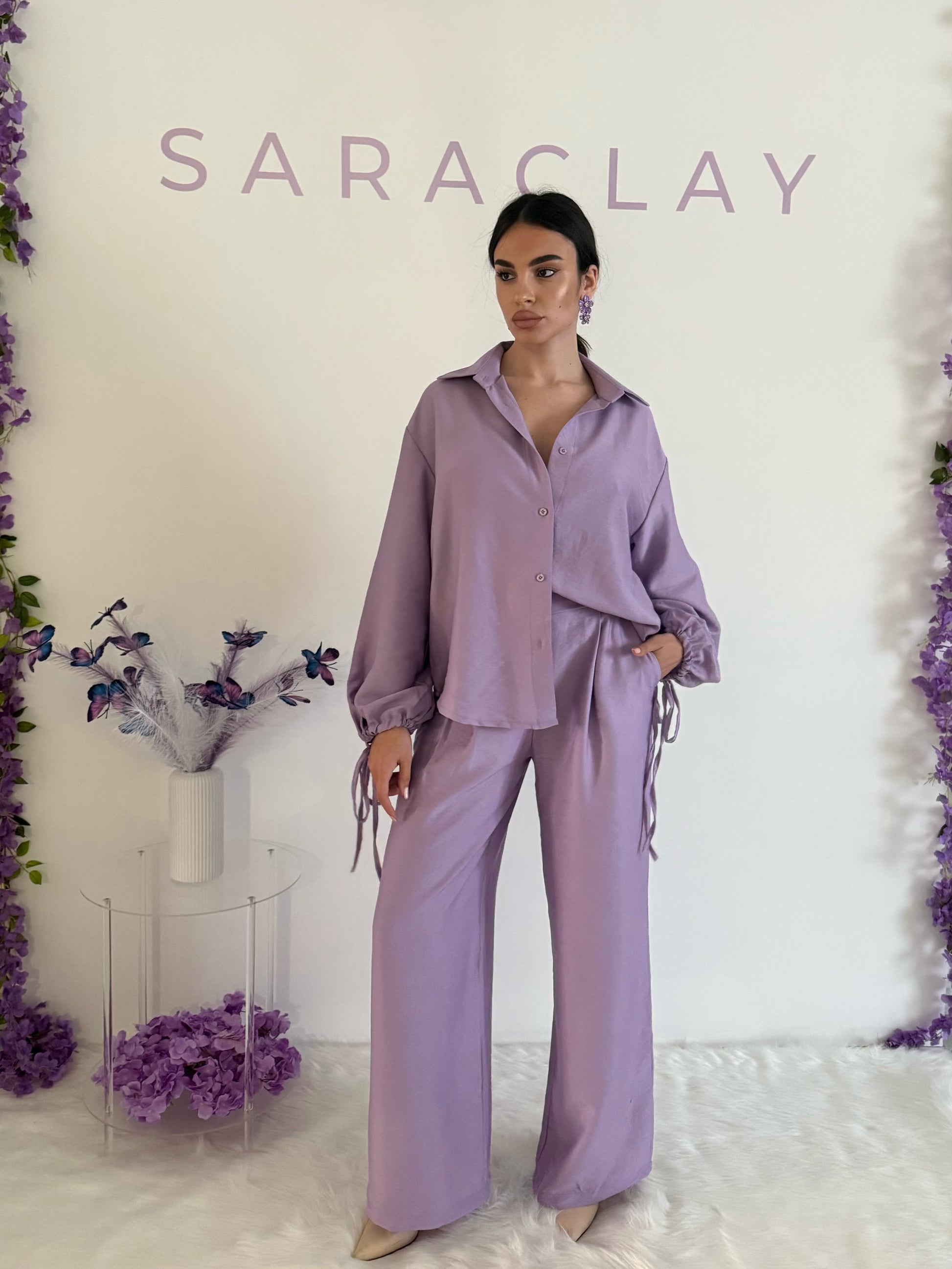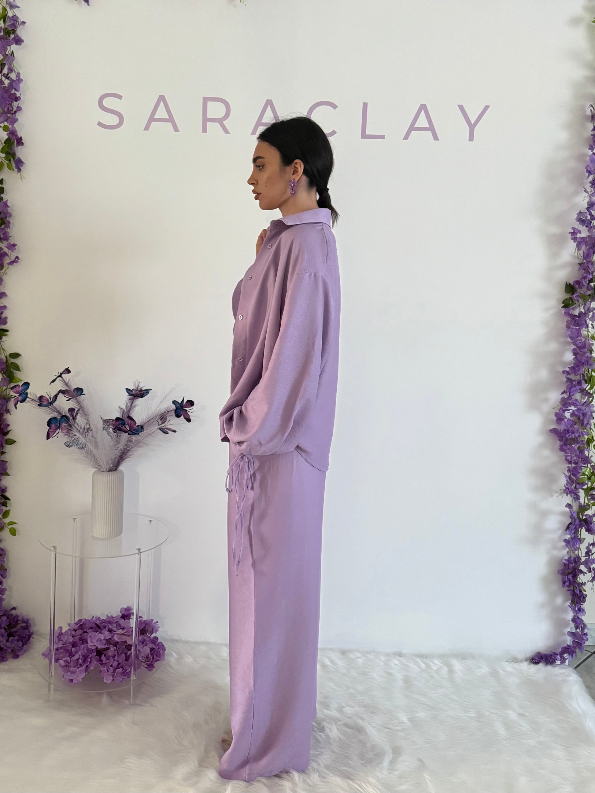 Completo lilla super cool: top a reggiseno effetto body, camicia over portata aperta e pantaloni larghi a vita alta. Tutto over, ma con stile.