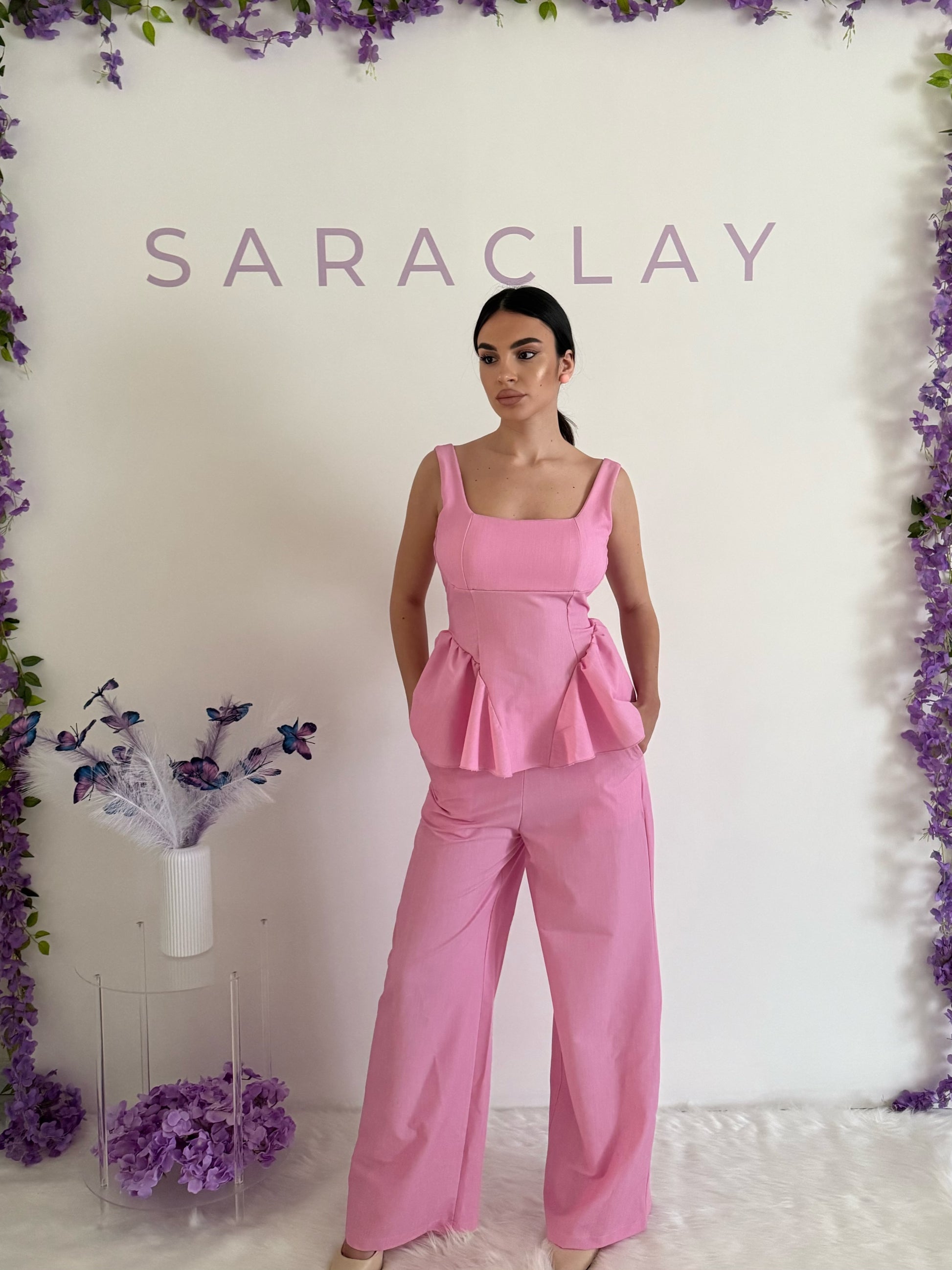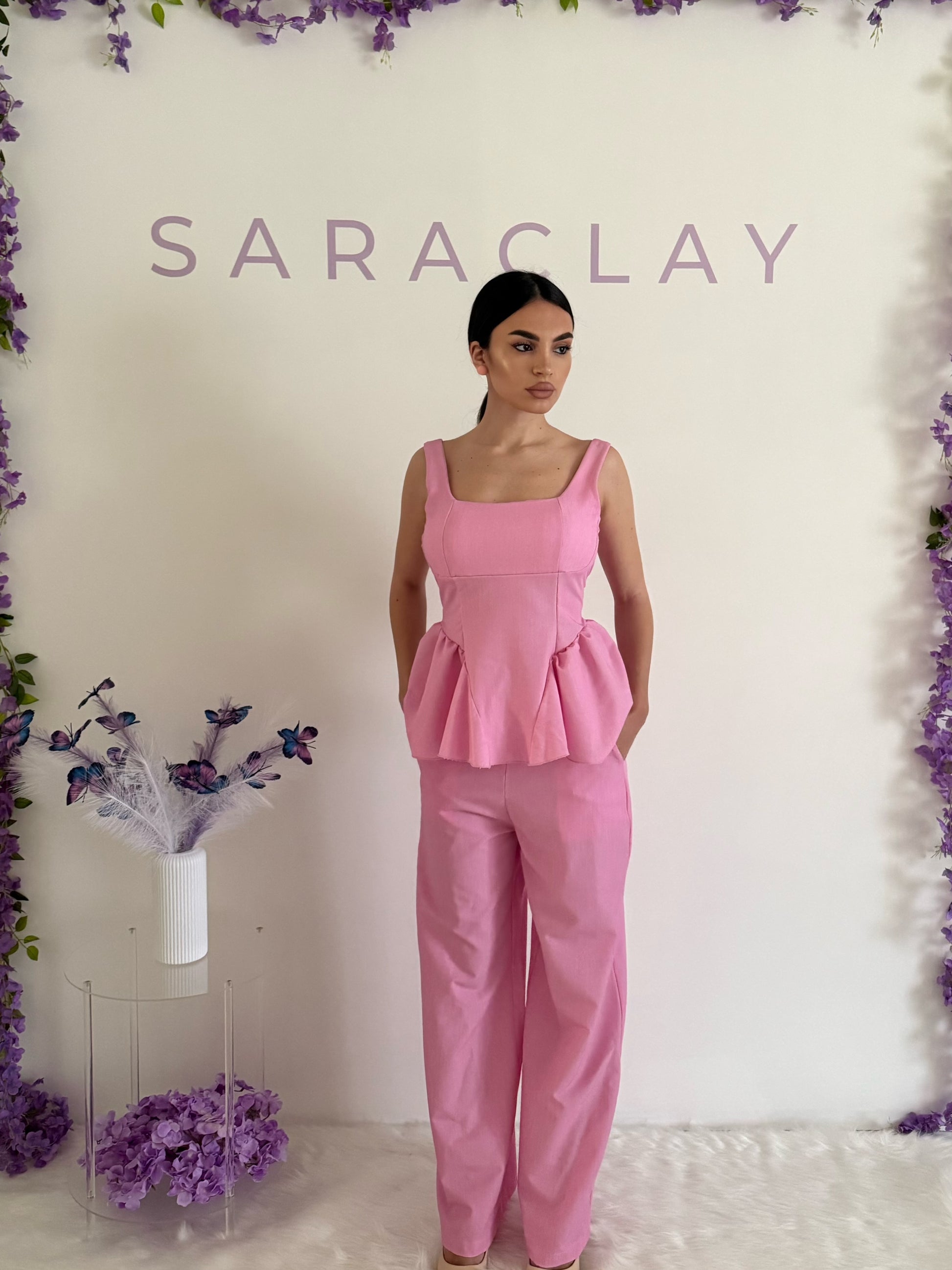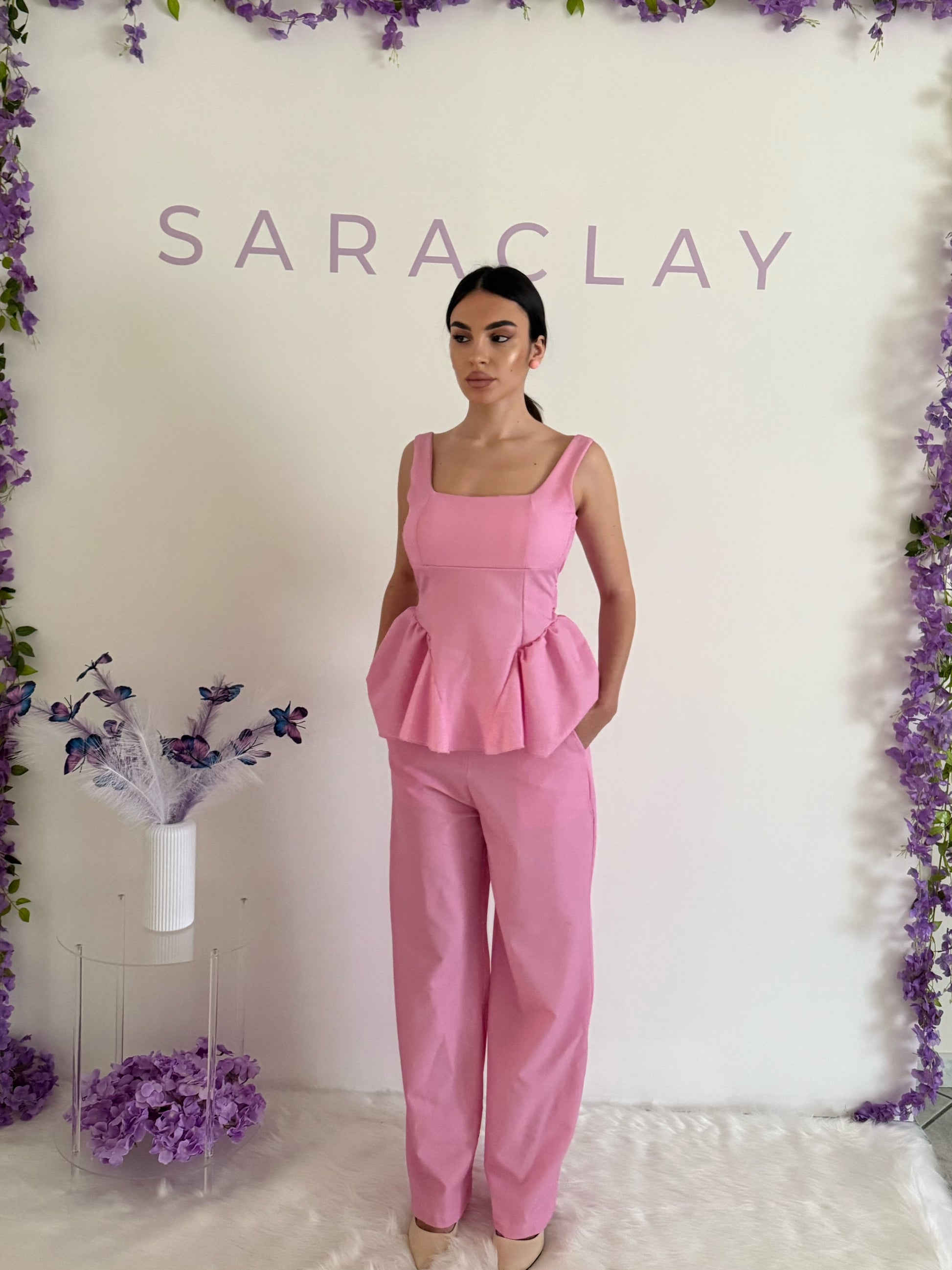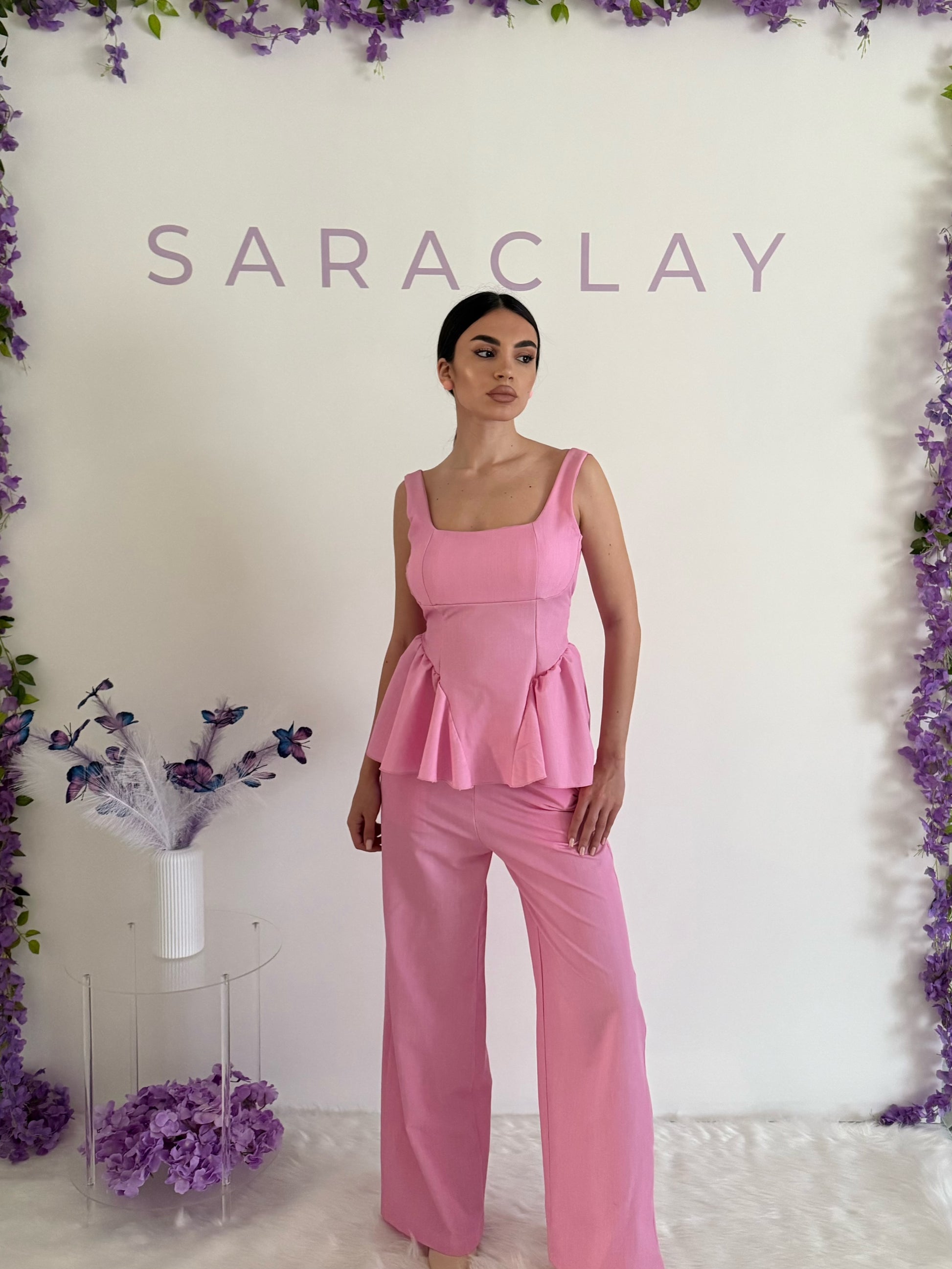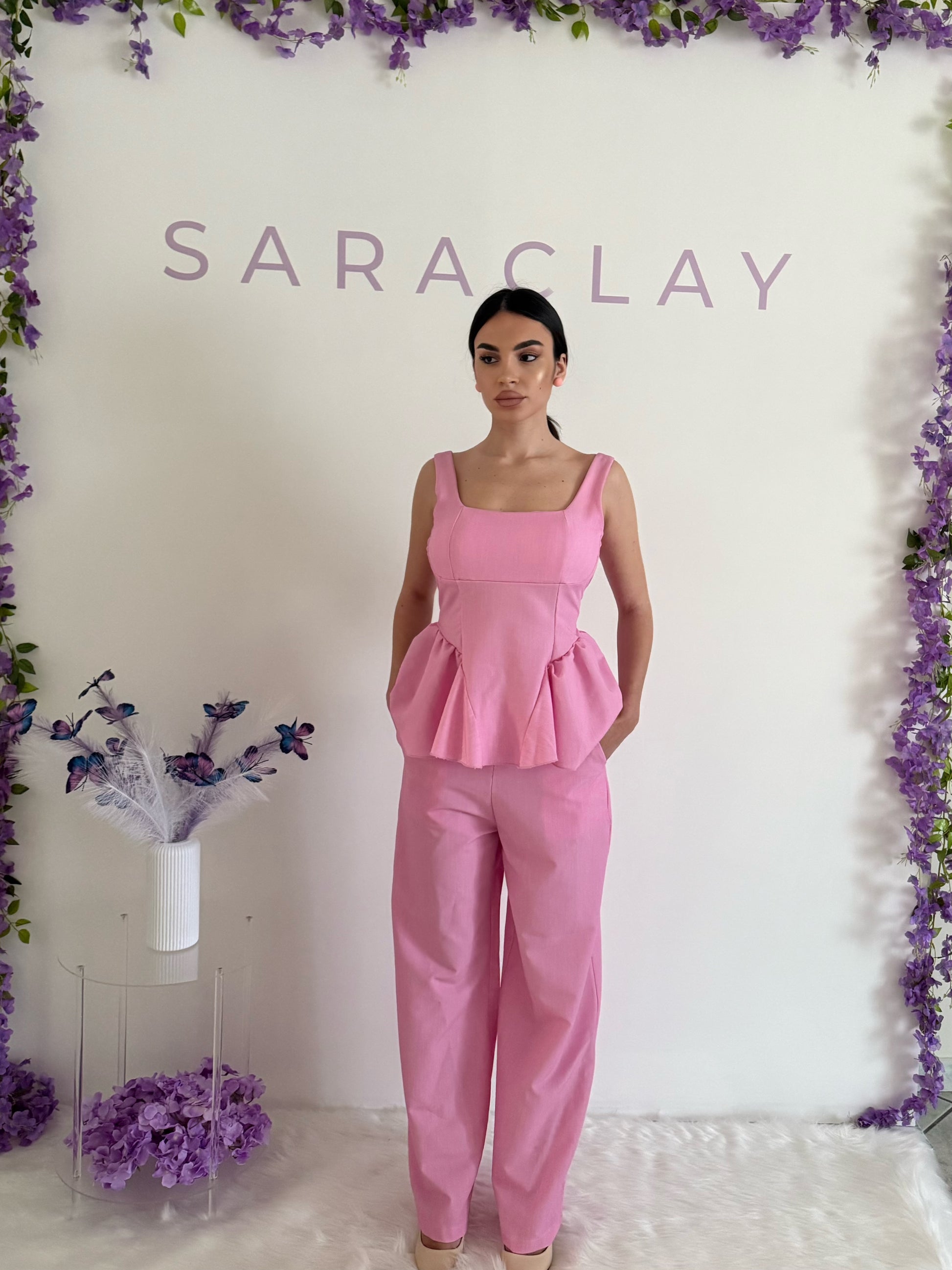 Completo rosa composto da top con scollatura elegante e pantaloni a vita alta. Sul retro, un fiocco romantico aggiunge un tocco femminile e sofisticato.