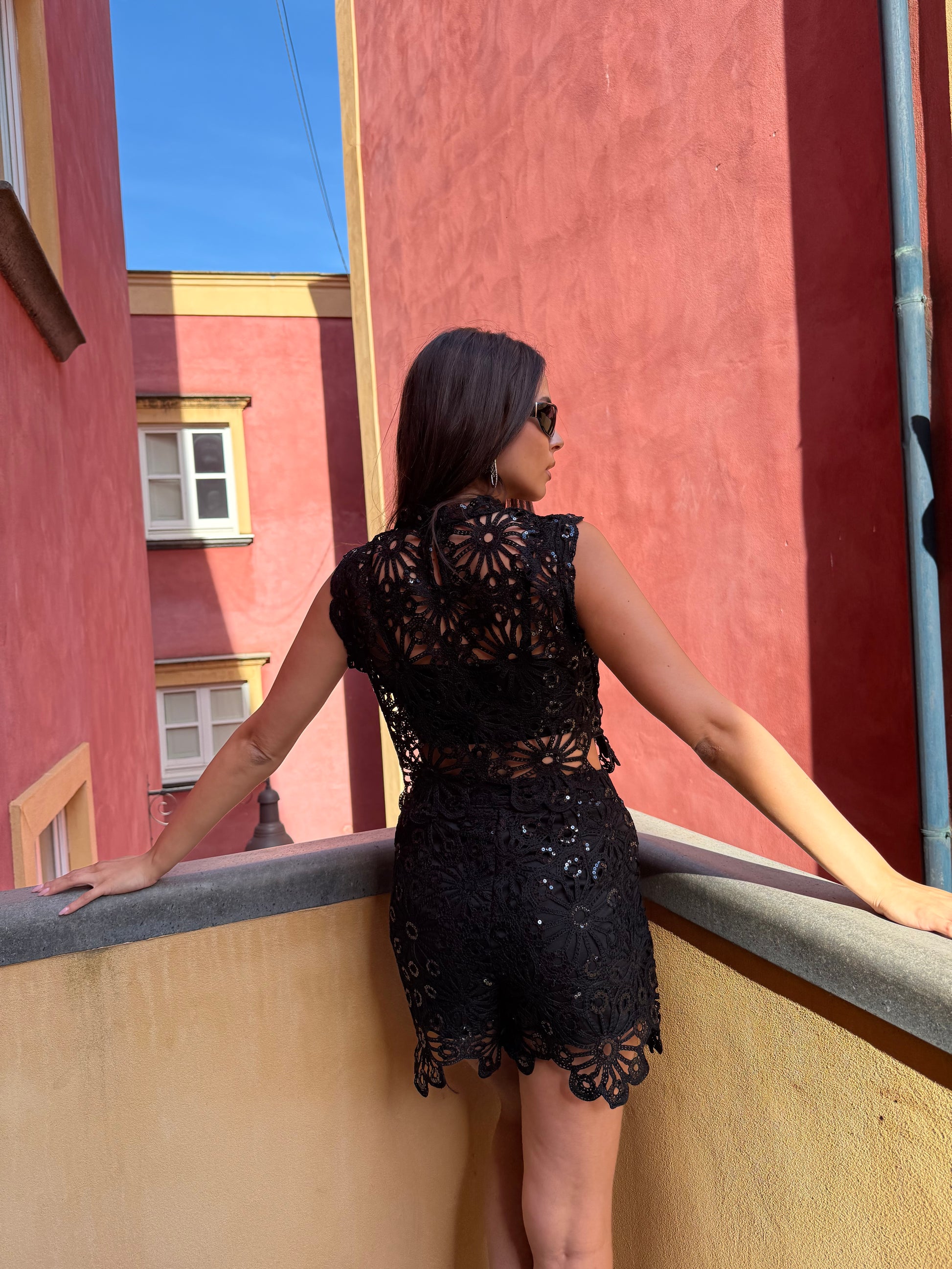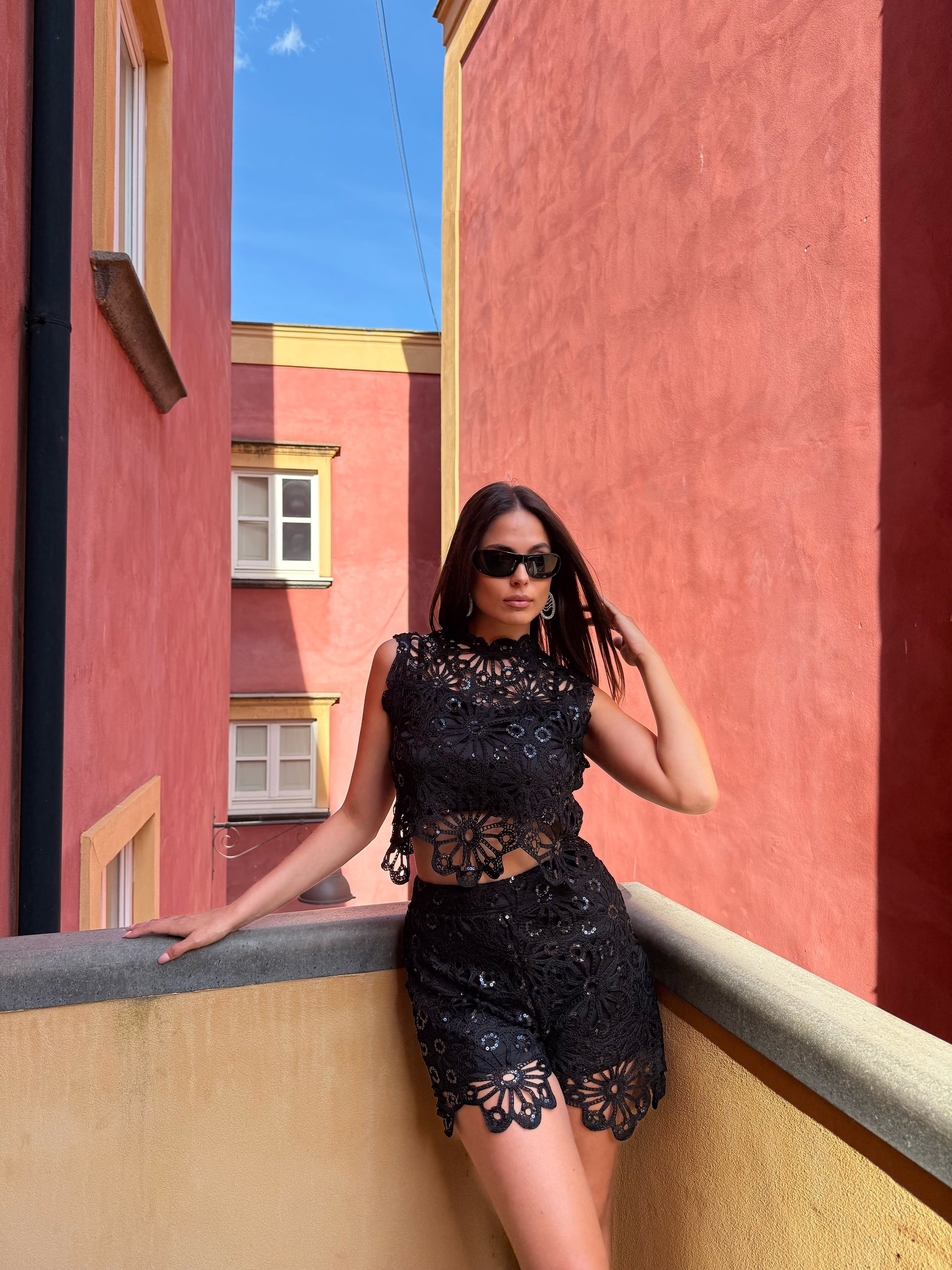 Un look raffinato e versatile, perfetto per un aperitivo o una serata chic. Il top ampio cade morbido sui fianchi con eleganza, mentre il pantaloncino a vita alta slancia la figura con stile. Fresco, comodo e sofisticato: l’outfit ideale per brillare con semplicità.