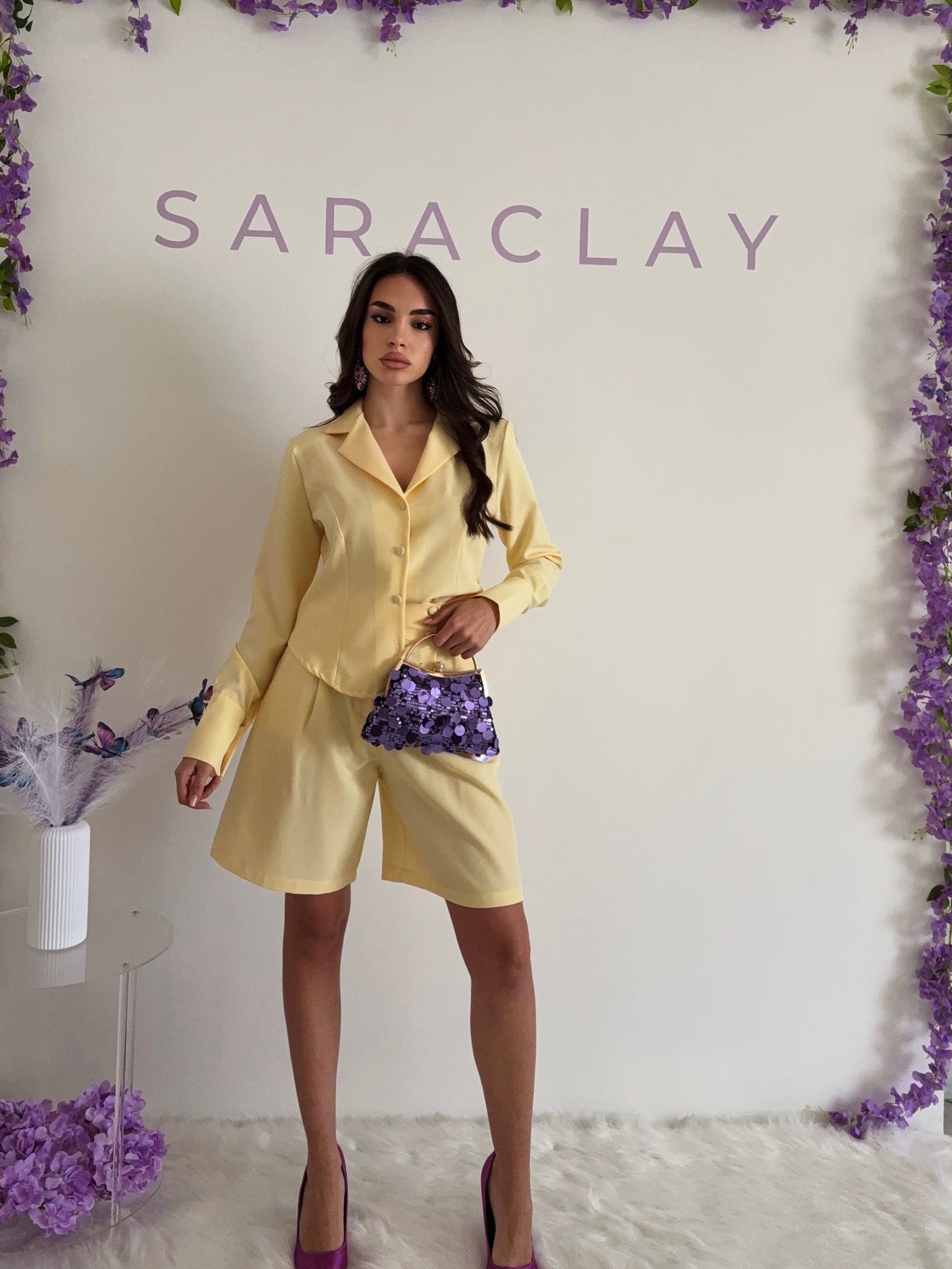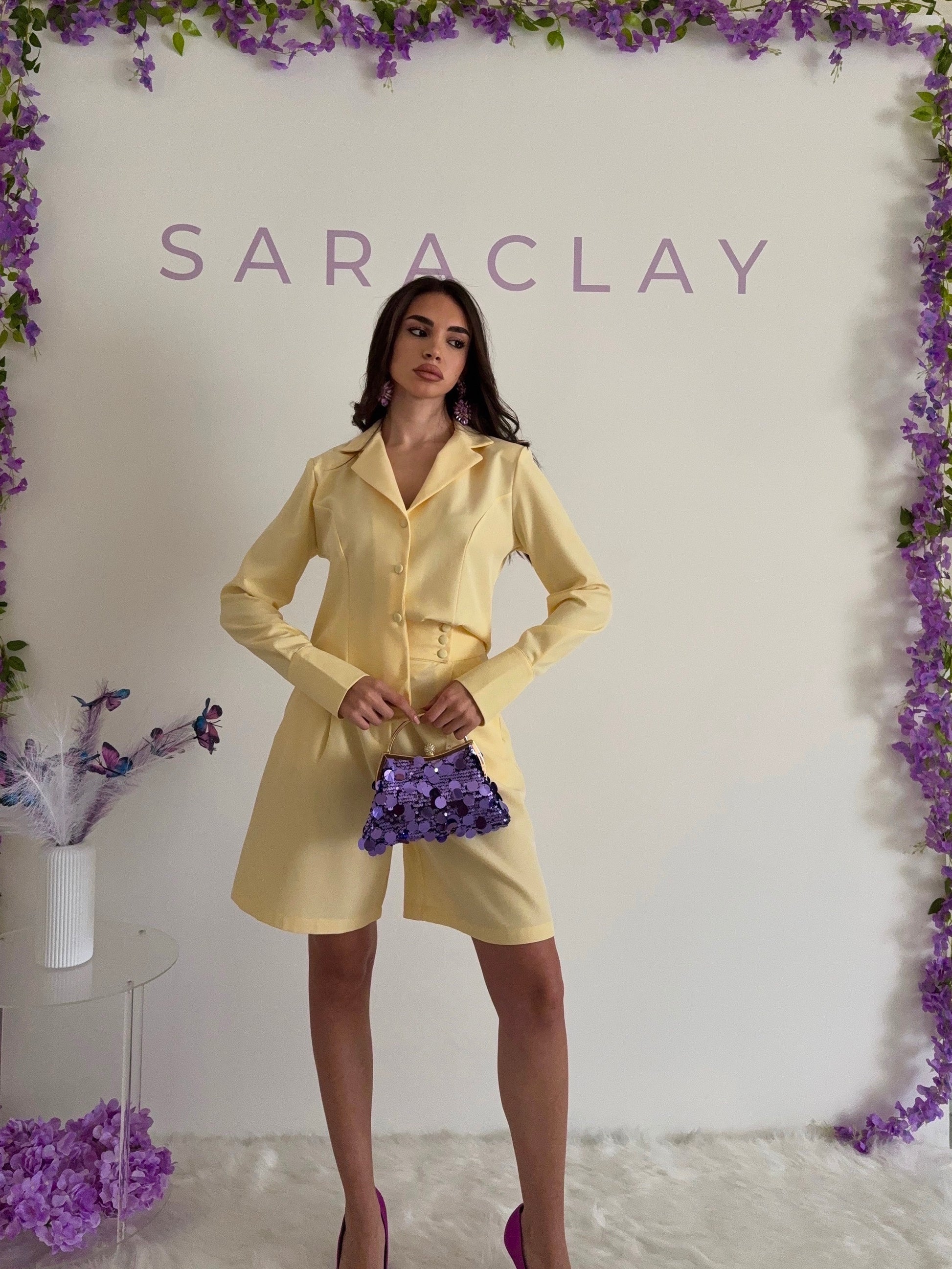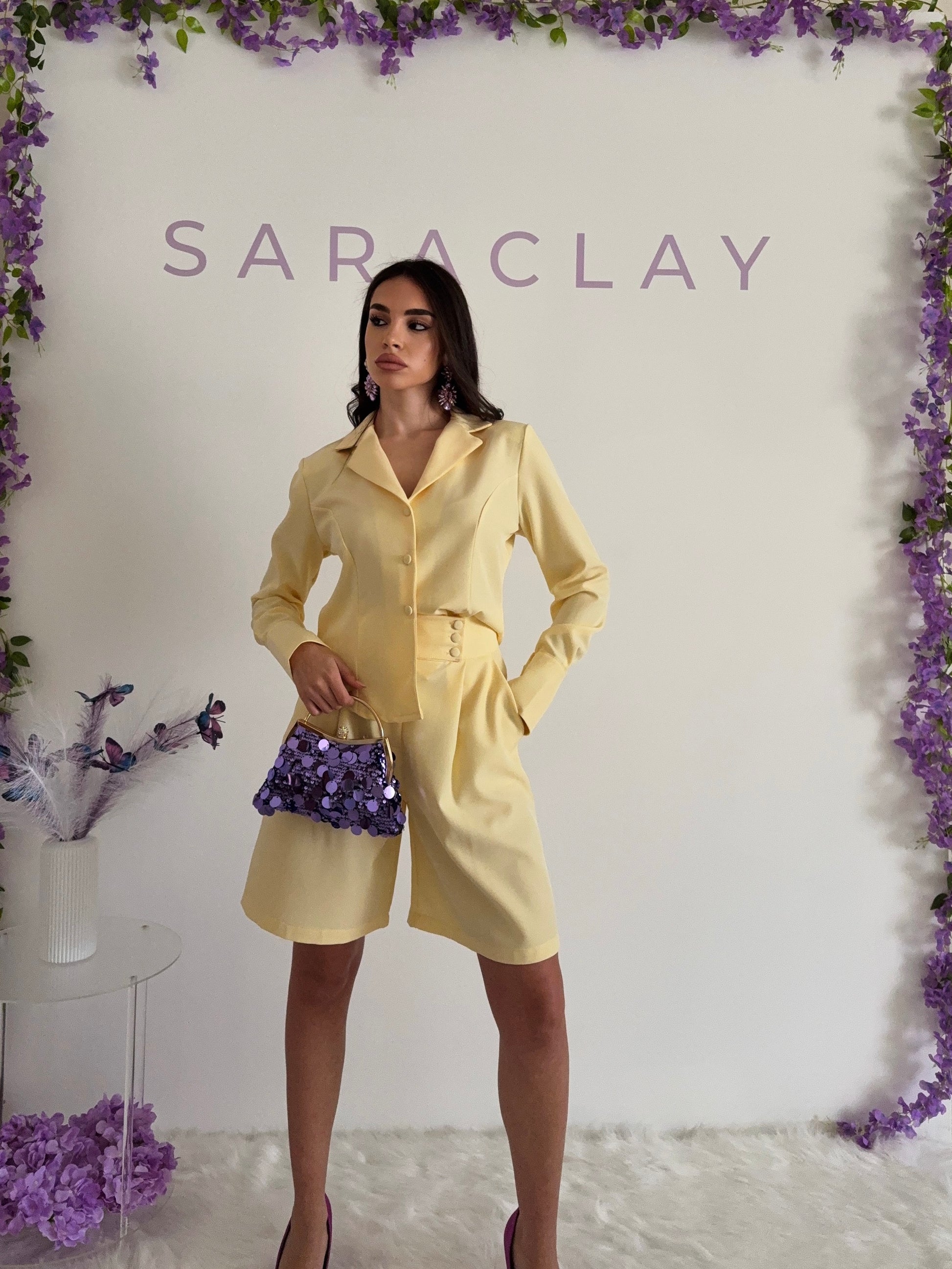 Un coordinato giallo vibrante che unisce il comfort alla freschezza dello stile estivo. La giacca dal taglio elegante e i bermuda dal fit perfetto offrono una soluzione sofisticata e comoda per ogni occasione casual-chic.