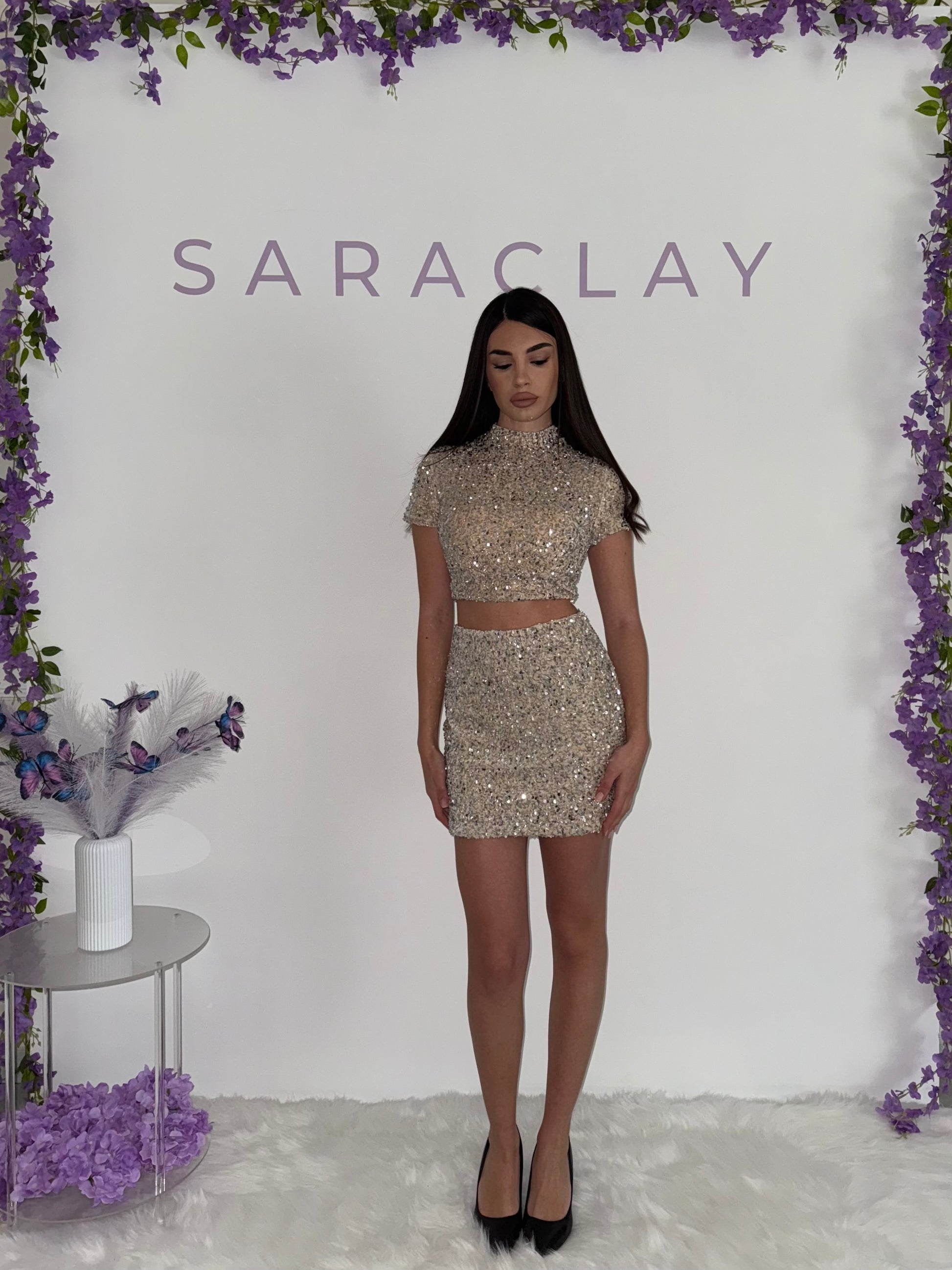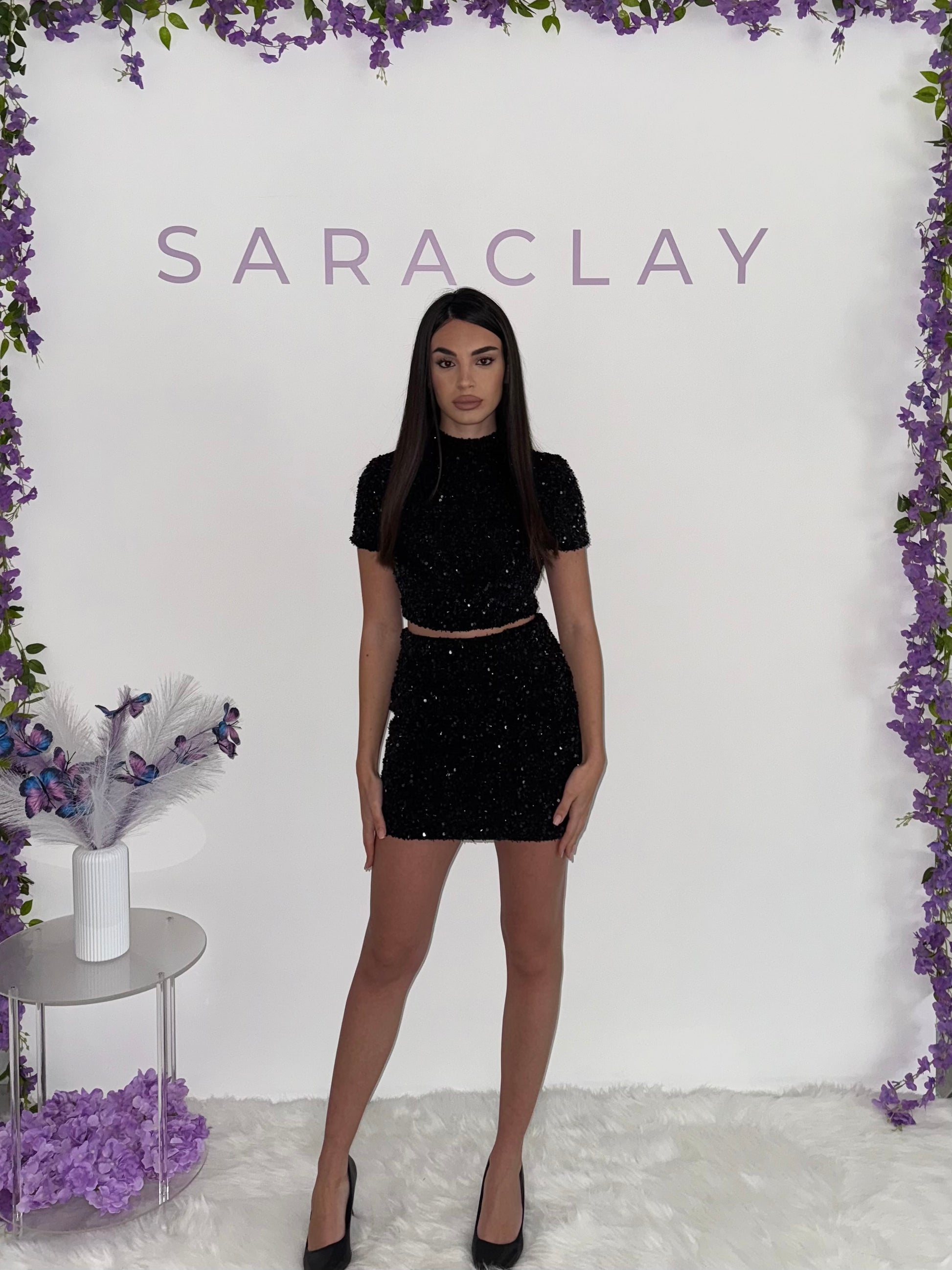 Coordinato brillantinato , per un look scintillante e super chic. Perfetto per le occasioni speciali, questo set unisce eleganza e luminosità, creando un effetto sofisticato e glamour.